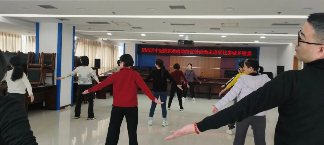 活动现场,荣昌区中医院的医护人员为大家带来了精彩的中医健身操展示。经络六拍操、八段锦表演中,一招一式尽显传统中医健身功法的魅力,引得现场观众纷纷观看、学习模仿。随后,在职业病防治健康讲座环节,带教老师还为大家详细讲解并示范了办公室常见职业病的康复训练方法,如颈部保健操、腰部保健操等,这些简单易学的动作,对于长期久坐办公的人员来说,具有很强的实用性。