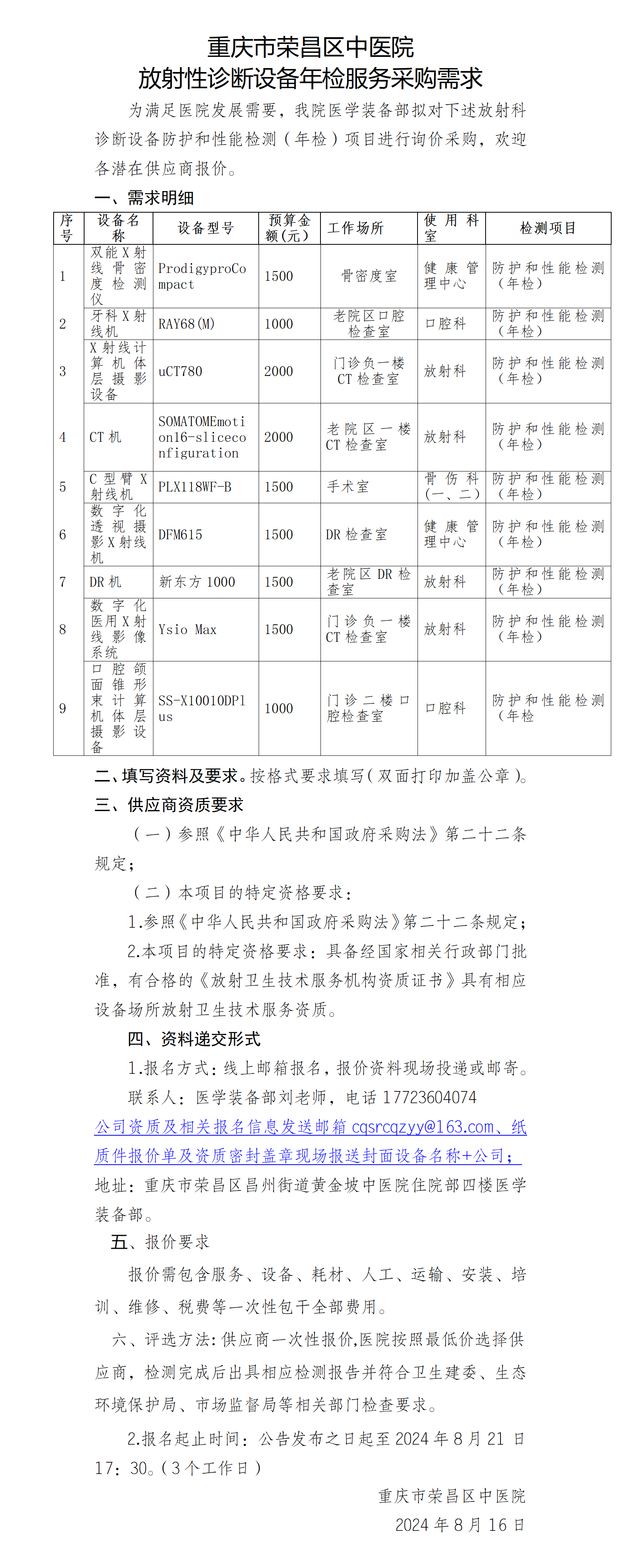 重庆市荣昌区中医院 放射性诊断设备年检服务采购需求