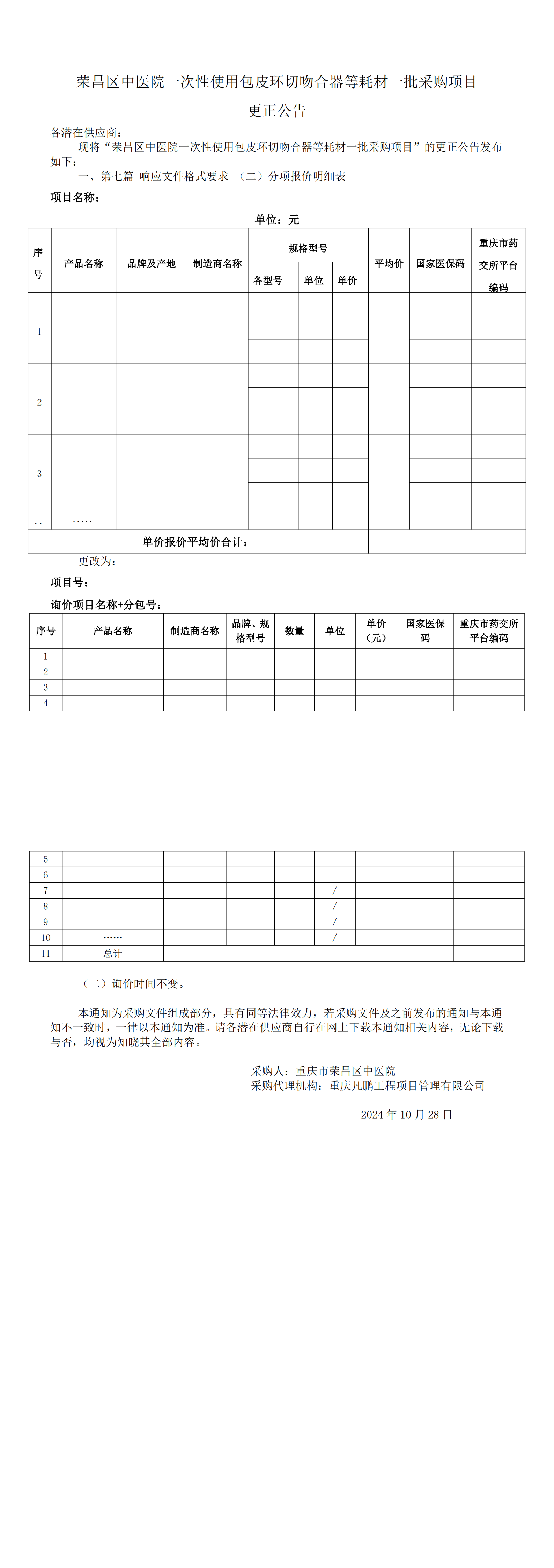 荣昌区中医院一次性使用包皮环切吻合器等耗材一批采购项目 更正公告