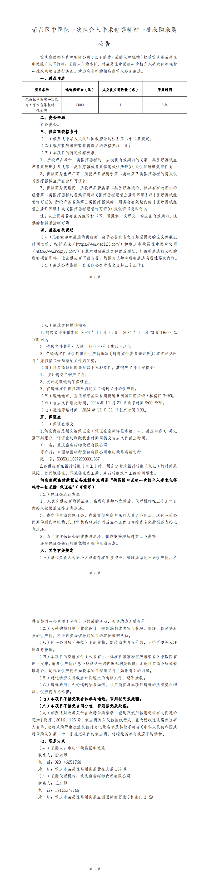 荣昌区中医院一次性介入手术包等耗材一批采购采购公告