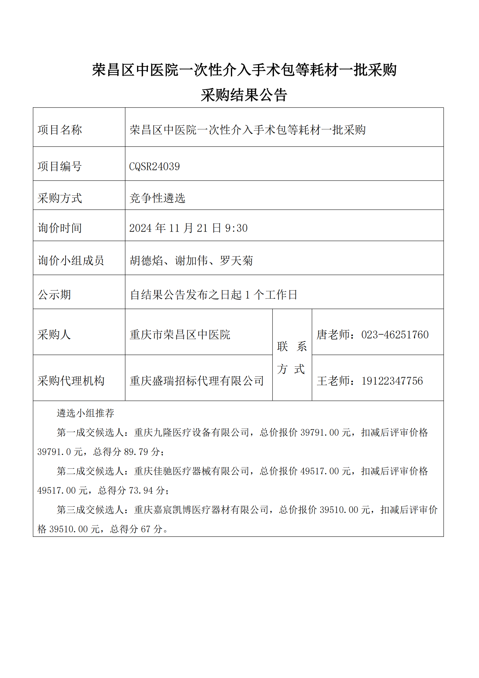 荣昌区中医院一次性介入手术包等耗材一批采购结果公告