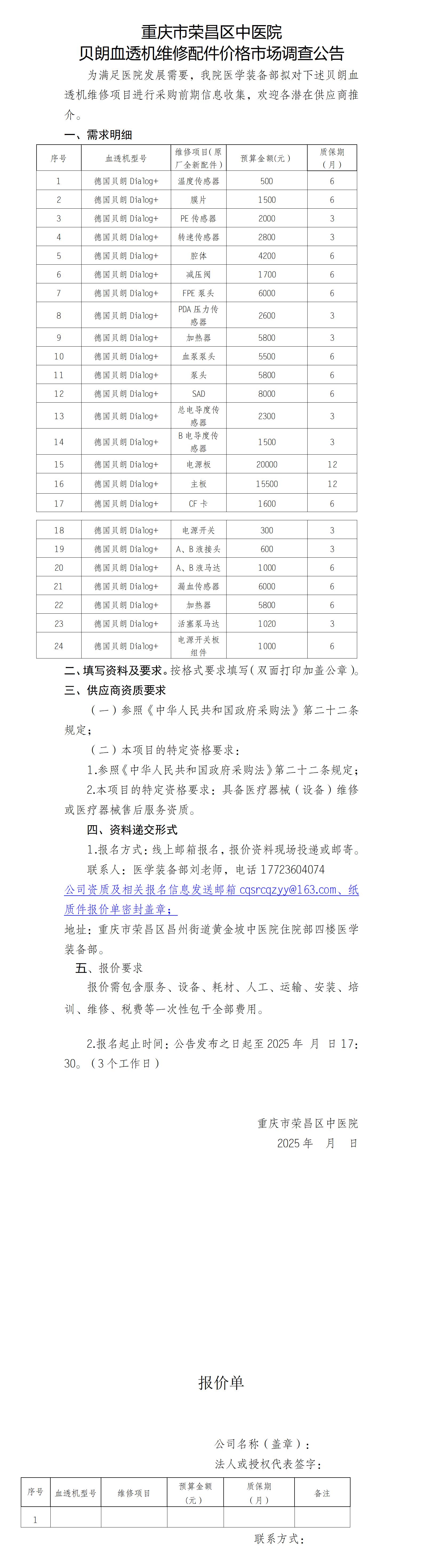 重庆市荣昌区中医院 贝朗血透机维修配件价格市场调查公告