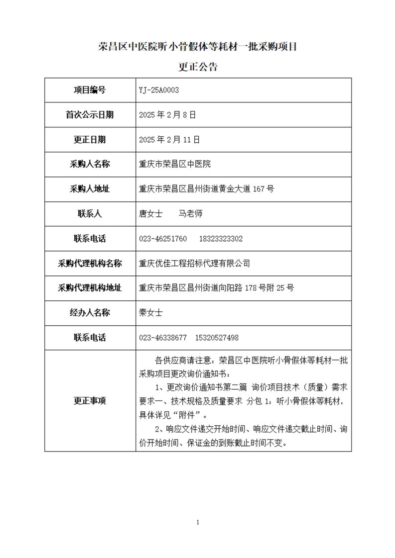 荣昌区中医院听小骨假体等耗材一批采购项目 更正公告