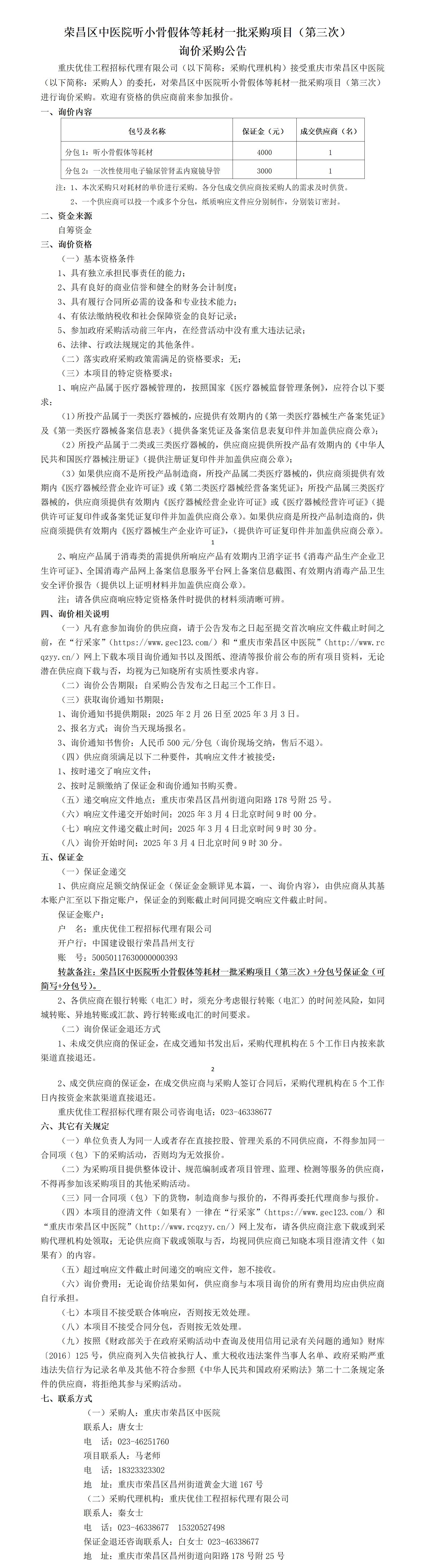 荣昌区中医院听小骨假体等耗材一批采购项目(第三次) 询价采购公告