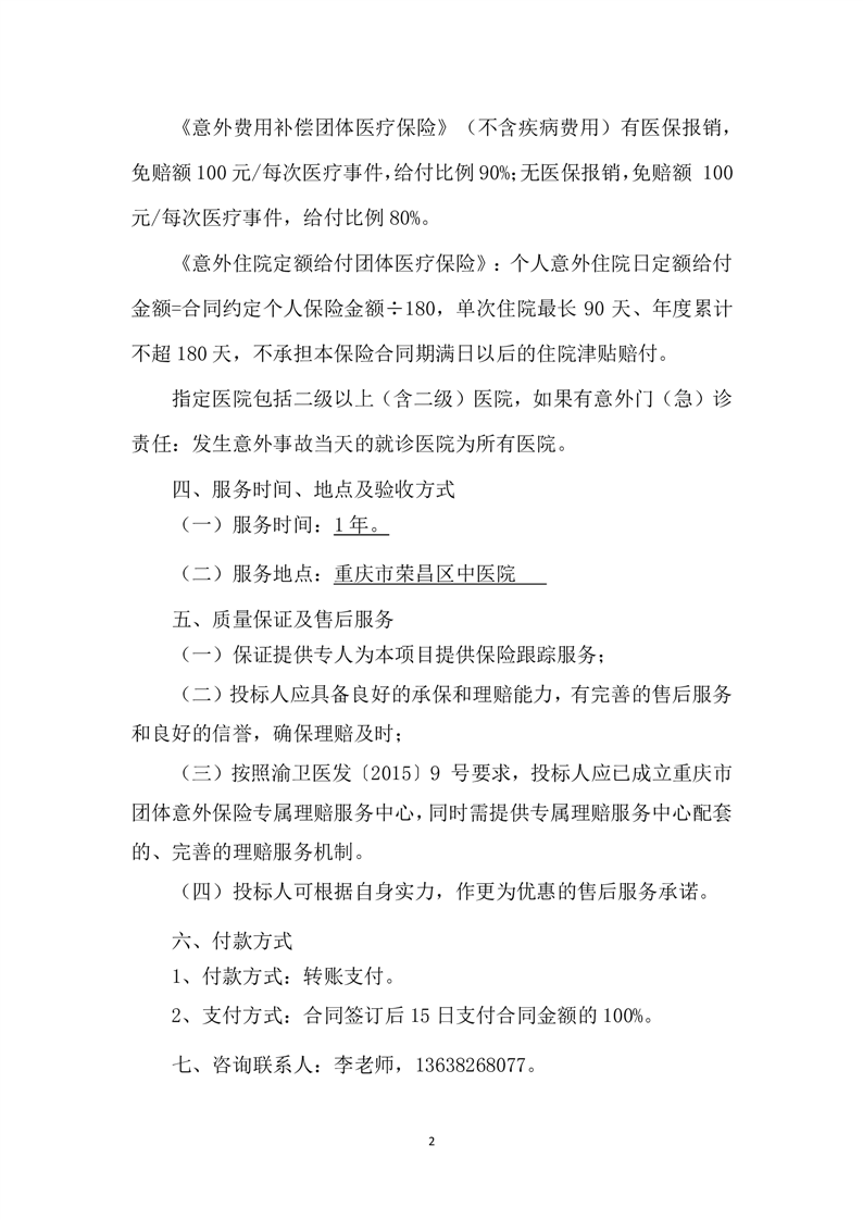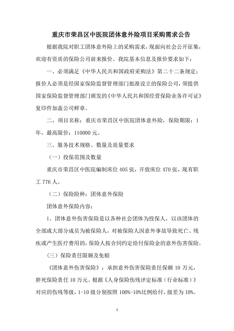 重庆市荣昌区中医院团体意外险项目采购需求公告